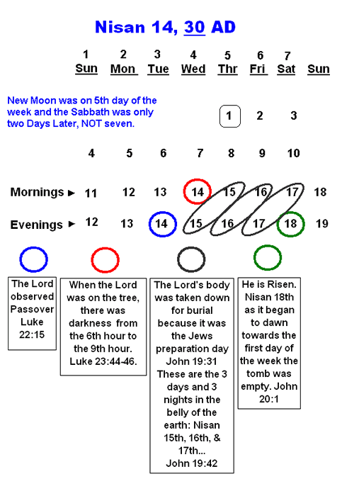 Sunday (18th); Saturday (17th); Friday (16th); Thursday (15th); Wednesday (14th); Tuesday (13th); Monday (12th); Sunday (11th); Saturday (10th); and so forth, counting backward, showing that the New moon or the 1st day of the 1st month fell on what we call Thursday (the 5th day of the week) and the Sabbath came 2 days later on the 3rd of Nisan not seven days after the new moon.