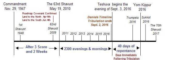 Interesting Observation: Counting forward from the 63rd Rabbinic Feast of Weeks, the day of the meeting between Mitchell and Abbas ( May 19th 2010 ) to the end of tribulation (Sept 2, 2016) as presented in the 5 year old Timeline, is exactly 2300 evenings and mornings to the day. (Dan. 8)